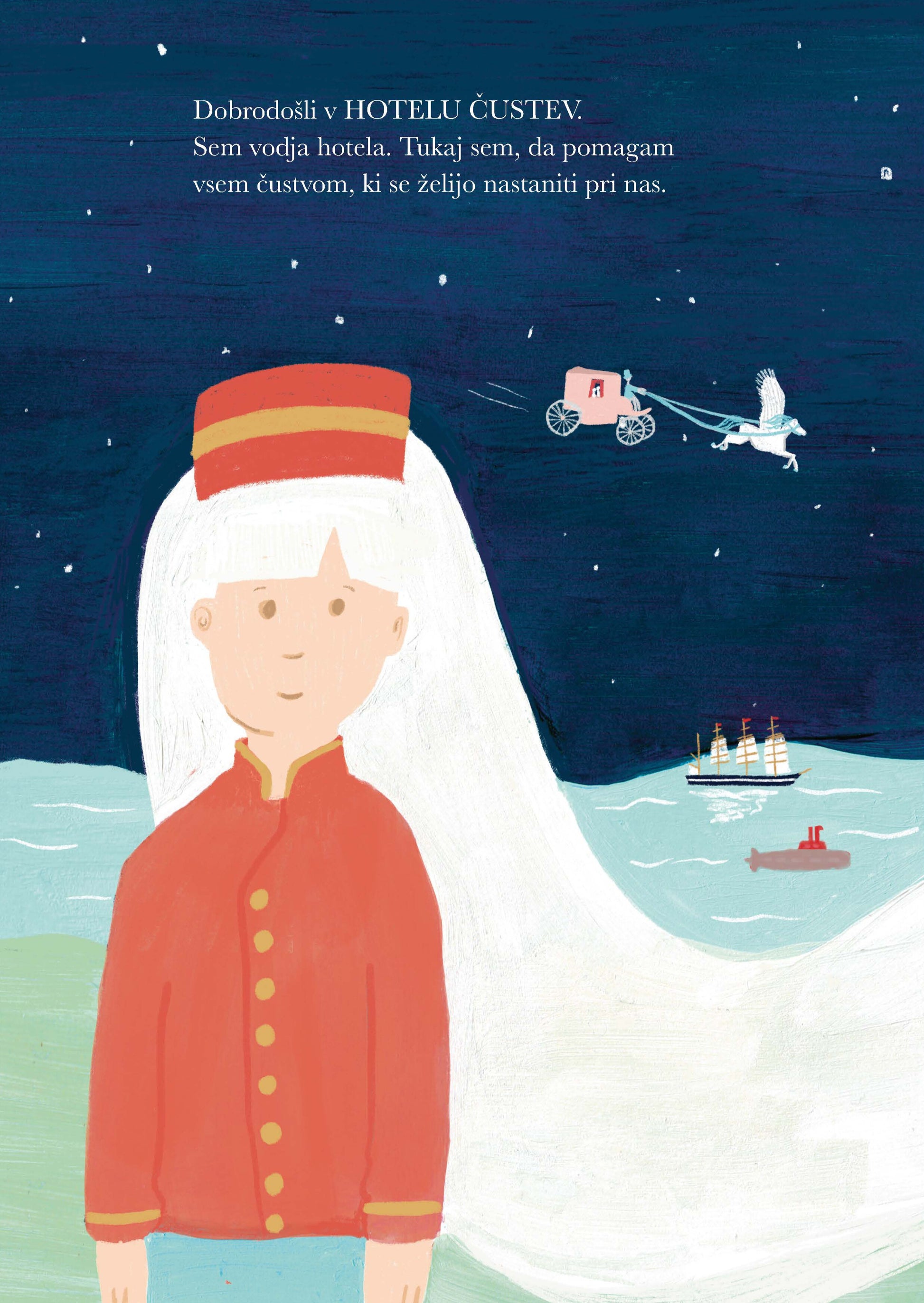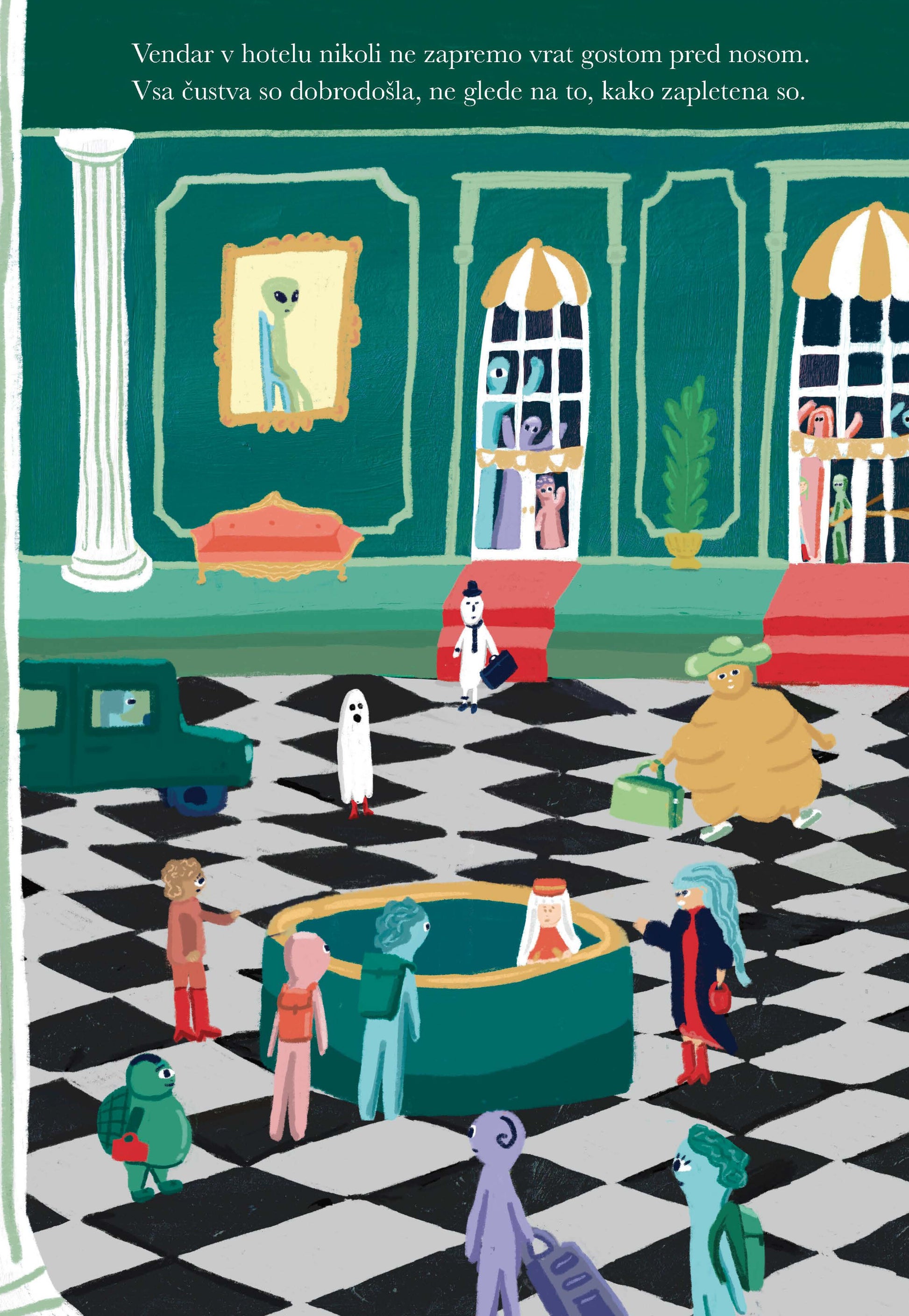 Jeza kriči, žalost tiho joka, hvaležnost se odpravi na sprehod … V tej topli, domiselni slikanici čustva oživijo kot obiskovalci hotela, ki vsako po svoje potrebuje pozornost, prostor in razumevanje. Dragocena pomoč pri čustvenem opismenjevanju otrok na nevsiljiv in kreativen način.