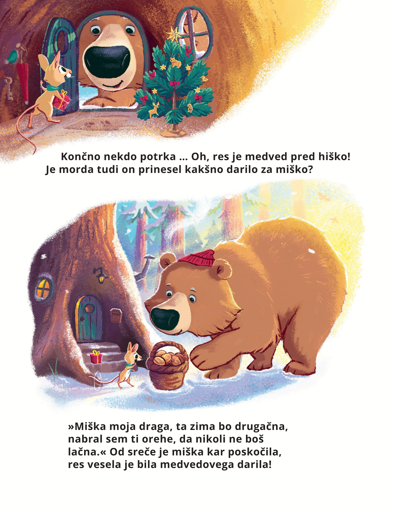 Miška in medved se zelo veselita novoletnih praznikov. Letošnje leto je prav posebno. Medveda prvič ni premagal zimski spanec. Z miško si izmenjata darili in medved svoje darilo odnese domov. Ko ga končno hoče odviti, ugotovi, da ima prevelike šape.